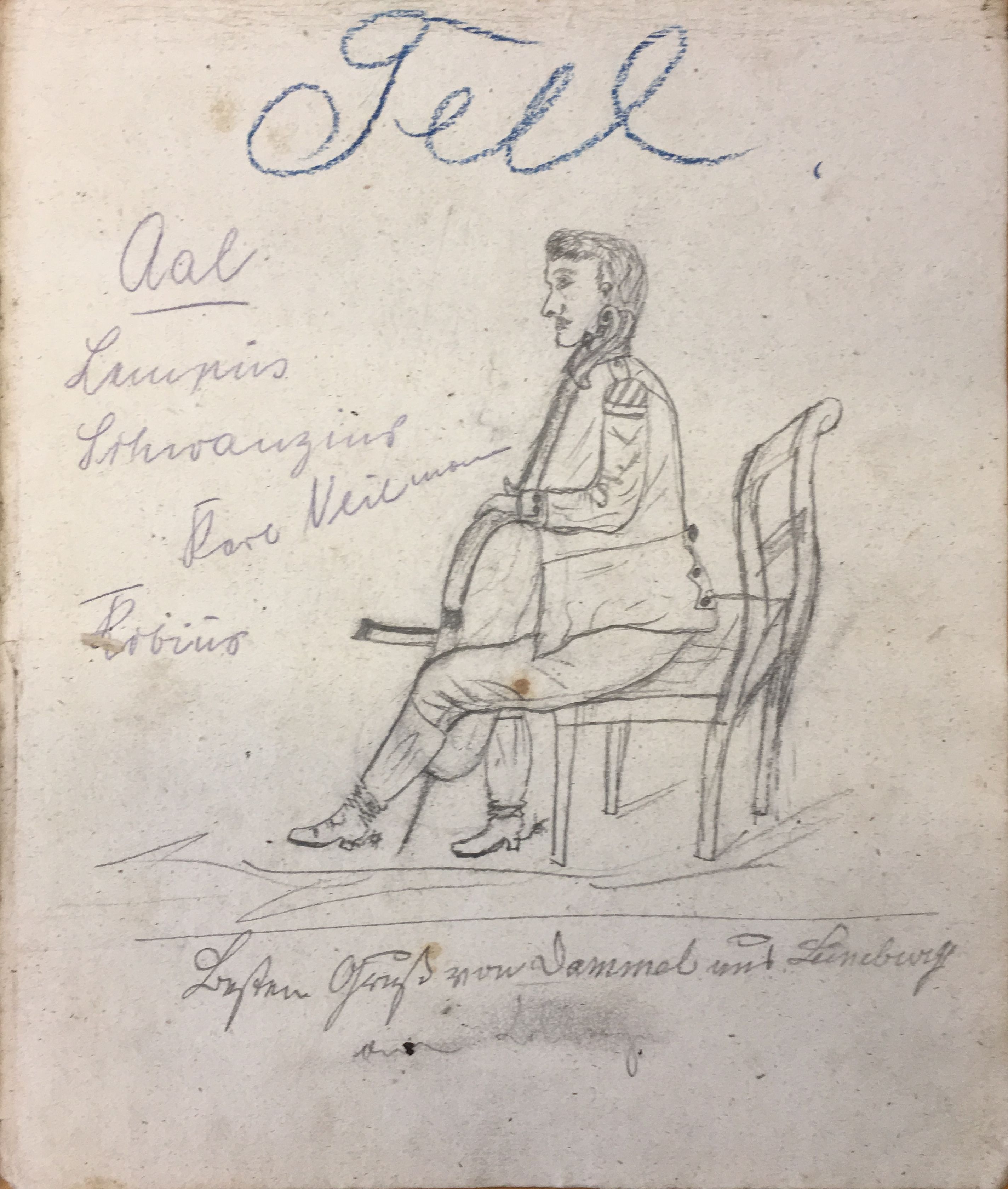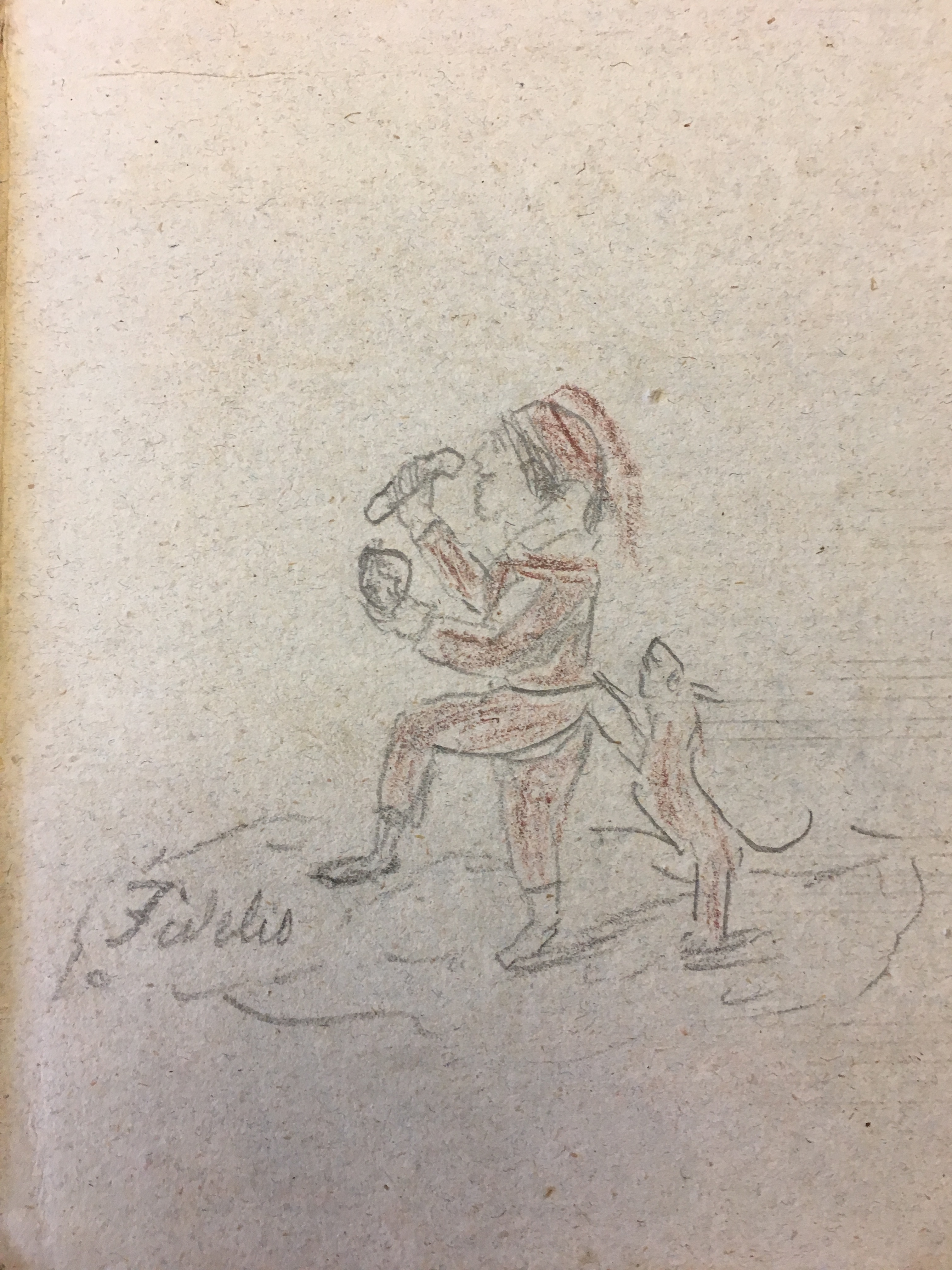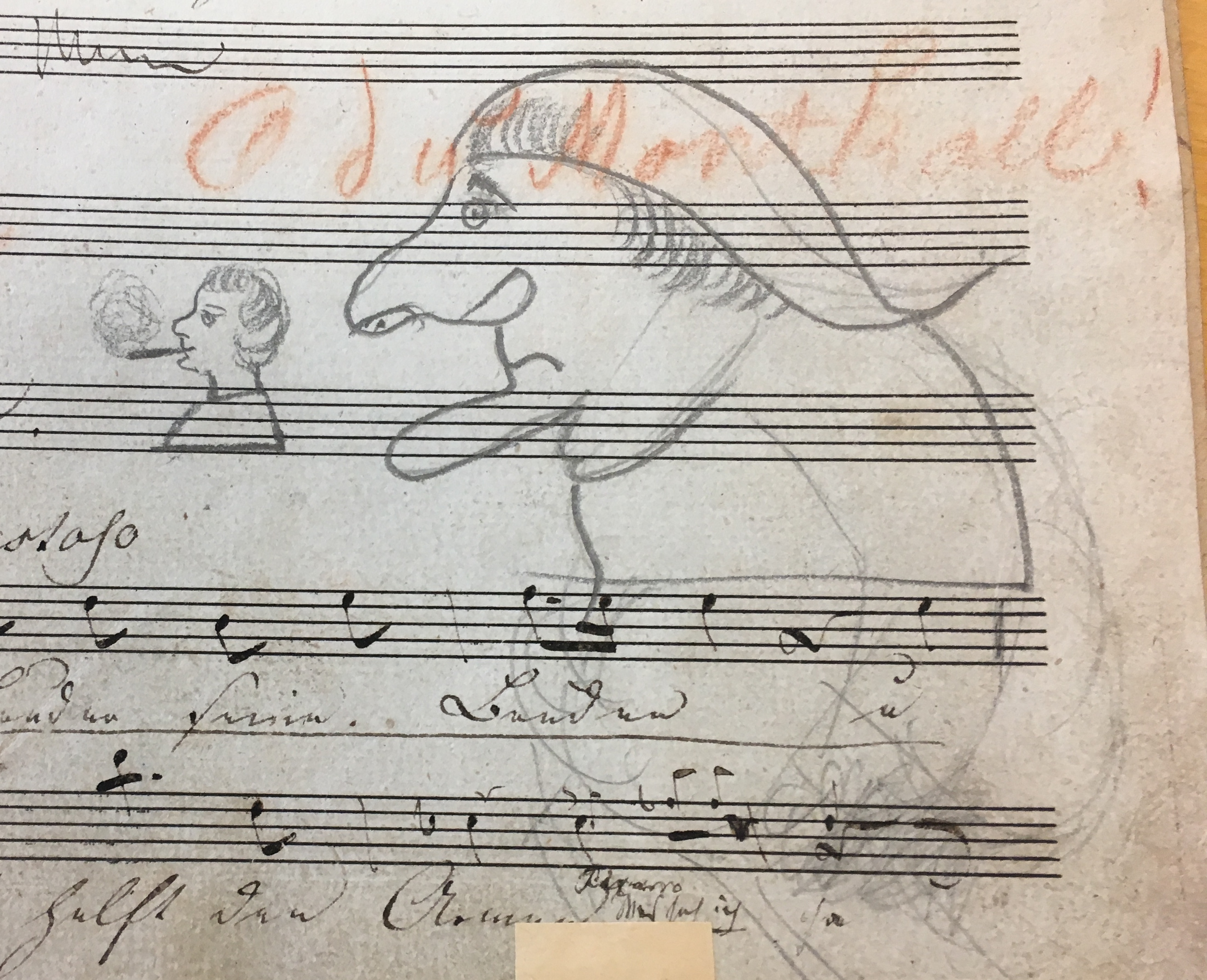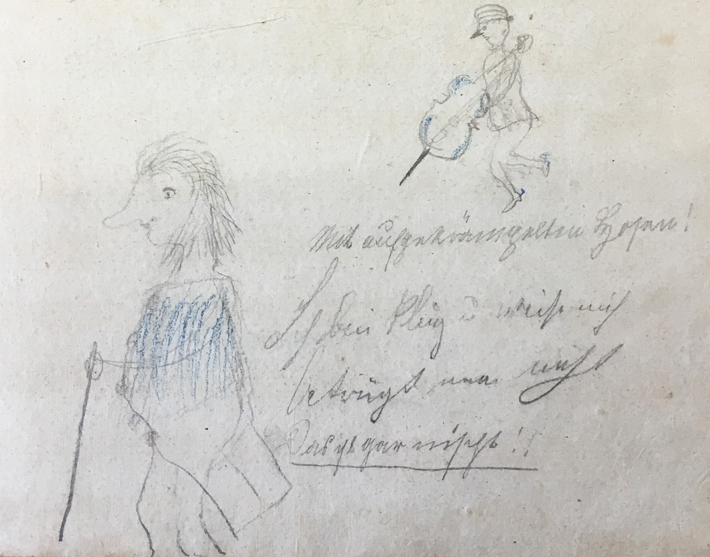 Gelegentlich gibt es aber auch sehr hübsche Zeichnungen, die manchmal auch Bezug auf die jeweilige Oper nehmen, wie die Zeichnung aus der Stimme des 2. Fagotts. Wieviel Ähnlichkeiten dieses Bild des van Bett mit der realen Darstellung der Rolle auf der Bühne hat, lässt sich nicht ermitteln. (Ebensowenig natürlich eine Ähnlichkeit des laufenden Cellisten mit einem Orchestermitglied.) Zumindest war ein anderer Fagottist mit der Zeichnung nicht einverstanden, denn er kommentiert: „Das ist gar nischt!“