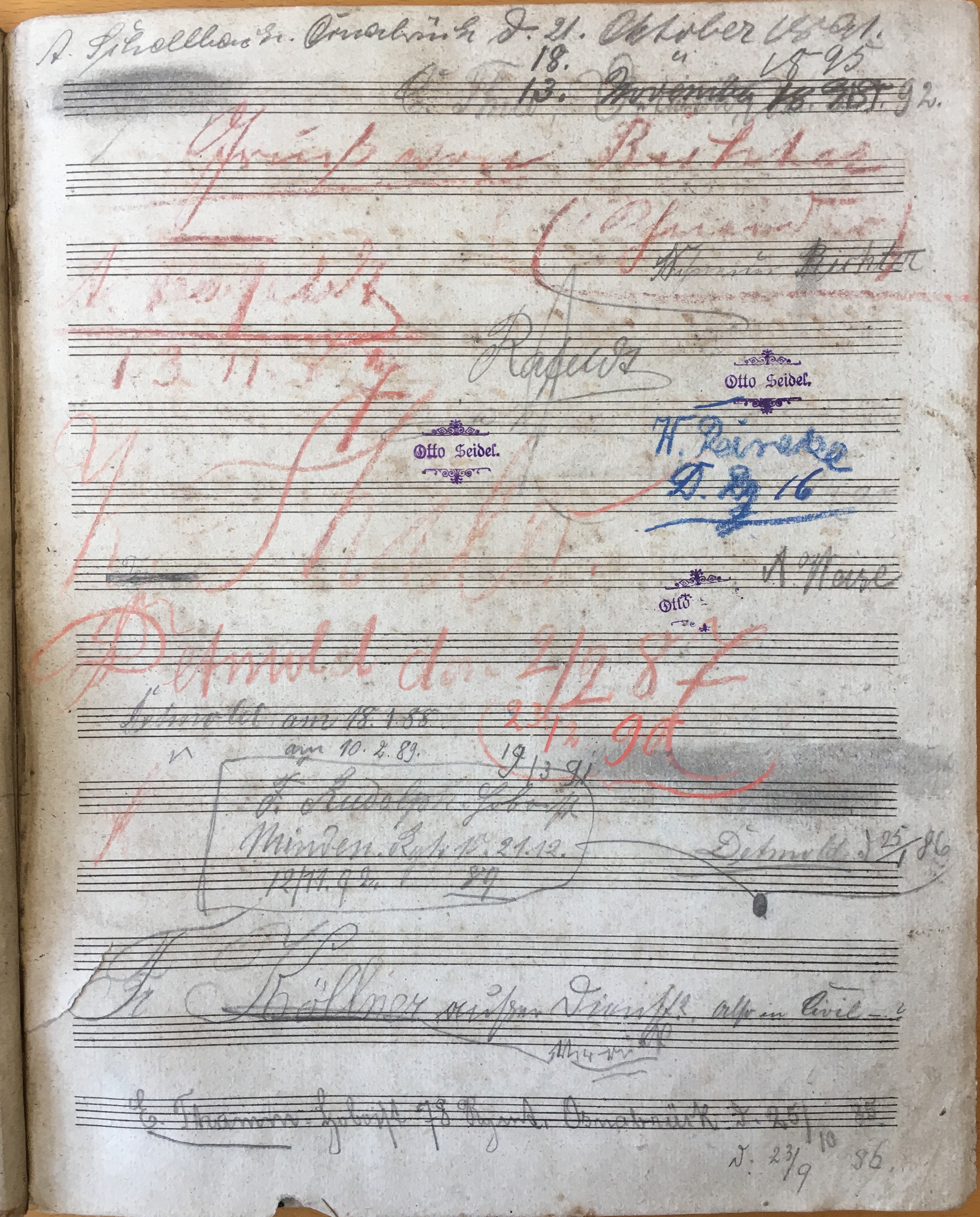 In den Orchersterstimmen gibt es sehr häufig am Ende Eintragungen. Hierbei handelt es sich z. T. nur um Namens- und Datumsvermerke, gelegentlich aber auch um nähere Angaben zu Aufführungen wie besondere Mitwirkende oder Anlässe (Benefize, Jubiläen). Bei zahlreichen Stimmen zu Zar und Zimmermann sind deshalb freigelassene Seiten am Ende bzw. die Innenseite des Rückumschlags mit Einträgen übersät, wie das Bild aus der Stimme der Oboe 1 zeigt.