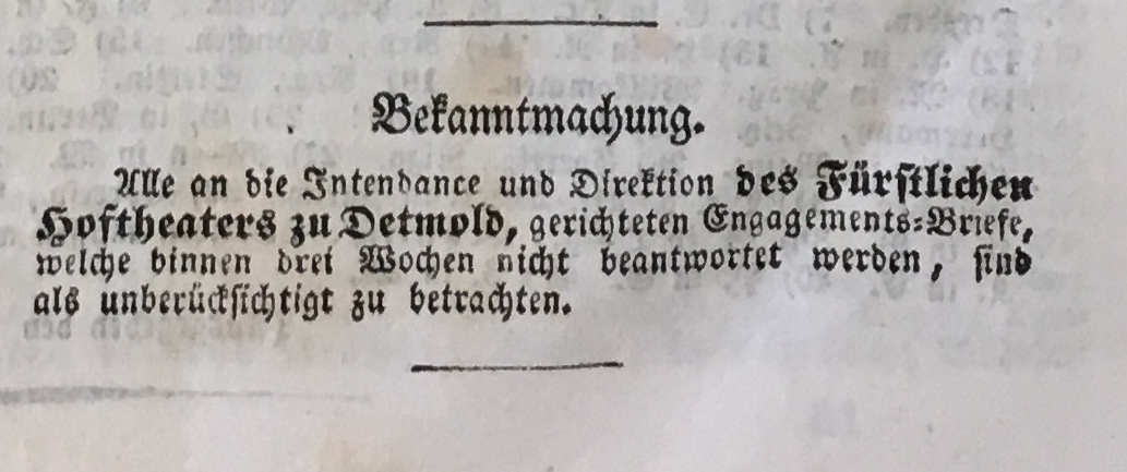 Am 15. Mai 1840 schaltete das Fürstl. Hoftheater in dieser Rubrik eine Anzeige, die belegt, dass das Interesse an einem Engagement bei dem Ensemble so groß gewesen sein muss, dass man nicht alle Anfragen beantworten konnte, denn warum sollte man sonst schreiben: „Alle an die Intendance und Direktion des Fürstlichen Hoftheaters zu Detmold, gerichteten Engagements-Briefe, welche binnen drei Wochen nicht beantwortet werden, sind als unberücksichtigt zu betrachten.“